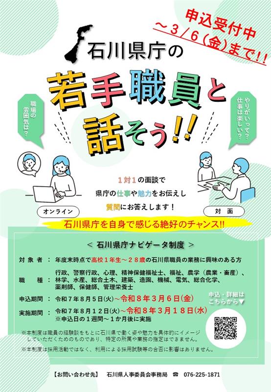 - ナビゲータとの面談は、石川県職員の仕事等の魅力を発信する広報活動の一環として実施するものであり、参加の有無は、採用試験の結果に一切影響しません。
