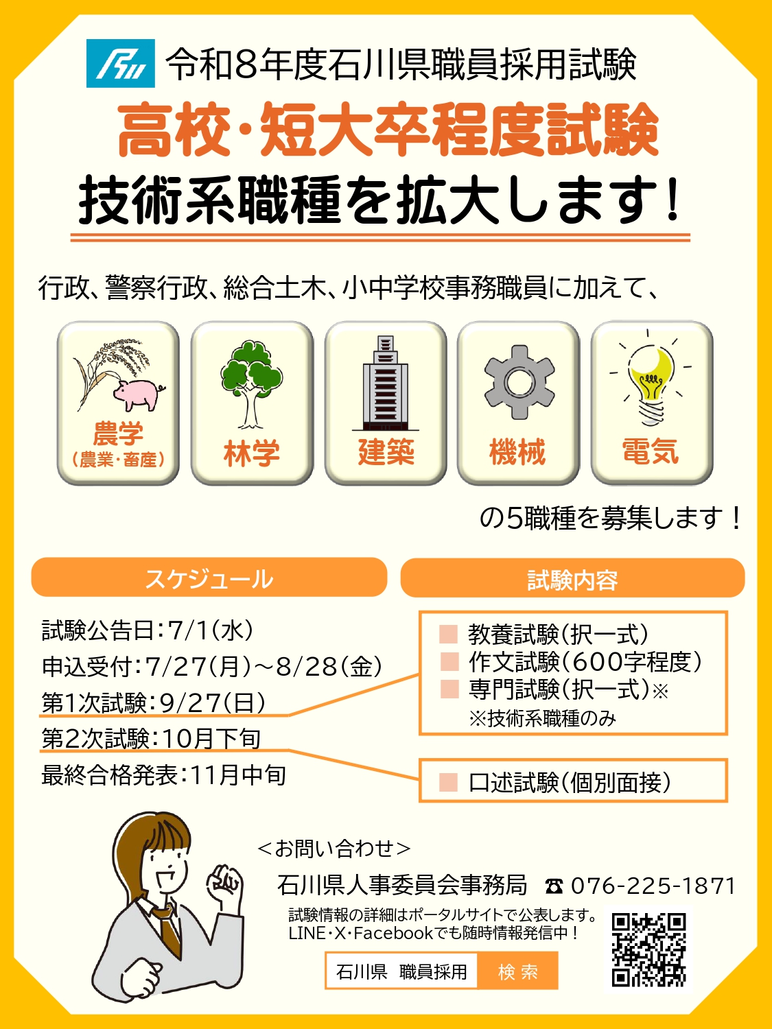 行政、警察行政、総合土木、小中学校事務職員に加えて、「農学(農業・畜産)」「林学」「建築」「機械」「電気」の5職種を募集します。